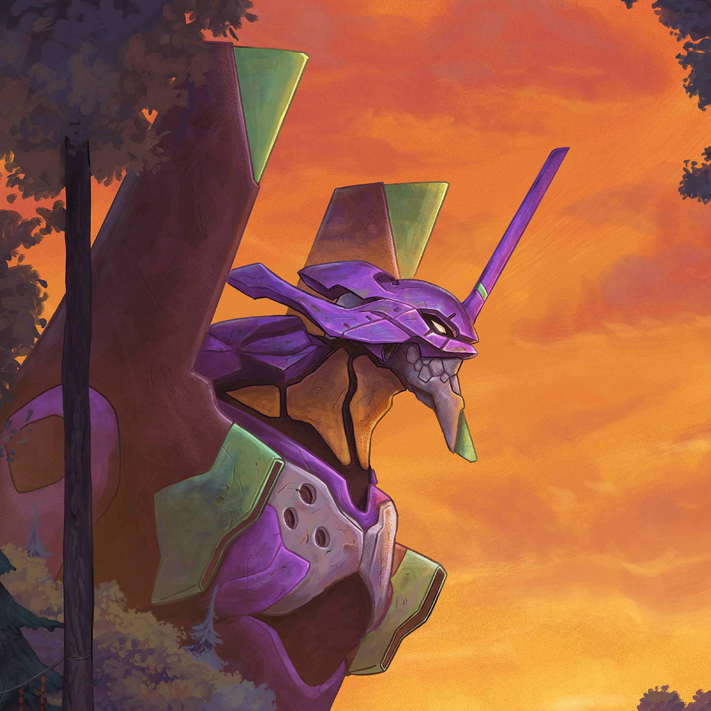La terza illustrazione è dedicata all'Eva 01 (初号機) della famosa serie d'animazione e dai manga Evangelion. Ho immaginato Shinji sulle scalinate che conducono al tempio di Nara con l’Eva “parcheggiato” poco distante. Una scena calma e calda, come l’eterna estate che vediamo nell’anime.